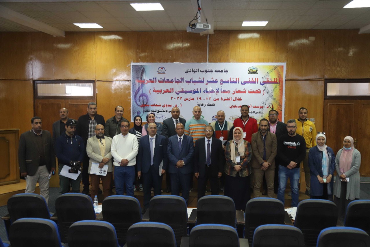 في اطار توجيهات الدكتور يوسف غرباوي رئيس جامعة جنوب الوادي بتوفير كافة سبل الراحة لوفود الجامعات المشاركة بالملتقى الفني التاسع عشر لشباب الجامعات الذي تنظمه الجامعة خلال الفترة من 13 الى 17 مارس الجاري اقيم اليوم بمقر الجامعة بقنا اجتماع برؤساء الوفود بحضور الدكتور بدوي شحات نائب رئيس الجامعة لشئون التعليم و الطلاب و الدكتور احمد كمال نصاري نائب رئيس الجامعة لشئون خدمة المجتمع وتنمية البيئة و الدكتور اشرف موسى عميد كلية التربية الرياضية رئيس اللجنة المنظمة للملتقى الفني و الدكتور محمد سعيد عميد كلية التربية النوعية مستشار النشاط الفني بالجامعة .