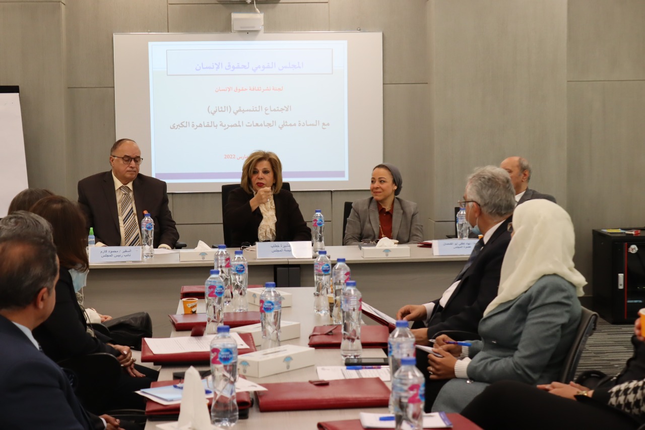 نظم المجلس القومي لحقوق الإنسان ( لجنة نشر ثقافة حقوق الإنسان ) الاجتماع التنسيقي الثاني مع ممثلي الجامعات الحكومية وغير الحكومية بالقاهرة الكبرى لمناقشة أطر التعاون لإعداد وتنفيذ برامج التثقيف والتوعية بحقوق الإنسان، وذلك بمقر المجلس بالتجمع الخامس بحضور السفيرة د. مشيرة خطاب رئيسة المجلس، والسفير د. محمود كارم نائب رئيس المجلس ، وعضوى المجلس نهاد أبو القمصان رئيسة لجنة نشر ثقافة حقوق الإنسان، ود. إسماعيل عبد الرحمن رئيس وحدة التدريب.