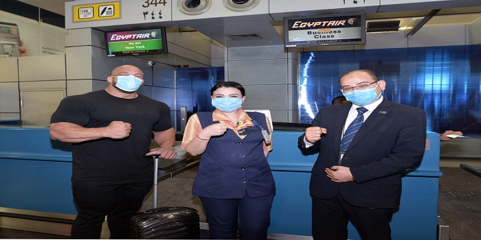 وحرص فريق من العلاقات العامة والمحطة والدعاية والإعلام بمصرللطيران علي استقبال البطل العالمي وانهاء إجراءات سفره من مبني الركاب رقم ٣ بمطار القاهرة .
