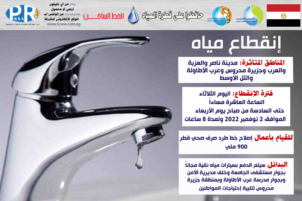 اعلنت شركة مياه الشرب والصرف الصحى بسوهاج عن قطع المياه عن مناطق مدينة ناصر والعزبة والعرب وجزيرة محروس وعرب الاطاولة والتل الأوسط اليوم الثلاثاء الموافق ١ نوفمبر ٢٠٢٢ فى تمام الساعة العاشرة مساءً وحتى السادسة من صباح الاربعاء الموافق ٢ نوفمبر 2022 ولمدة ٨ ساعة صرح بذلك المهندس محمد صلاح الدين عبد الغفار رئيس مجلس الإدارة والعضو المنتدب واضاف انه يتم خلال تلك الفترة القيام باعمال اصلاح خط طرد صرف صحى قطر ٩٠٠ ملى.