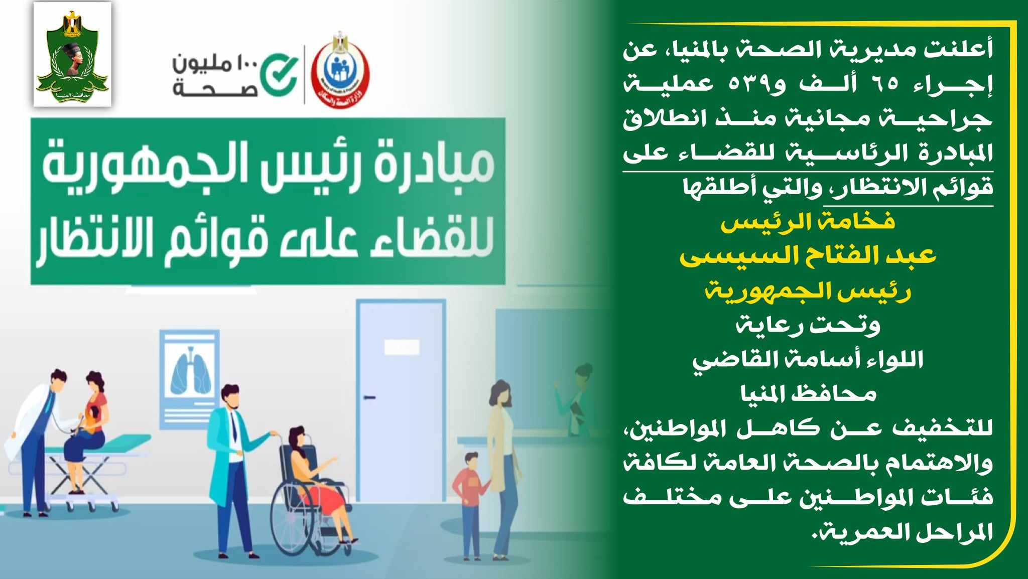 أعلنت مديرية الصحة بالمنيا، عن إجراء 65 ألف و539 عملية جراحية مجانية منذ انطلاق المبادرة الرئاسية للقضاء على قوائم الانتظار، والتي أطلقها فخامة الرئيس عبد الفتاح السيسى رئيس الجمهورية ، وتحت رعاية اللواء أسامة القاضي محافظ المنيا، للتخفيف عن كاهل المواطنين، والاهتمام بالصحة العامة لكافة فئات المواطنين على مختلف المراحل العمرية.