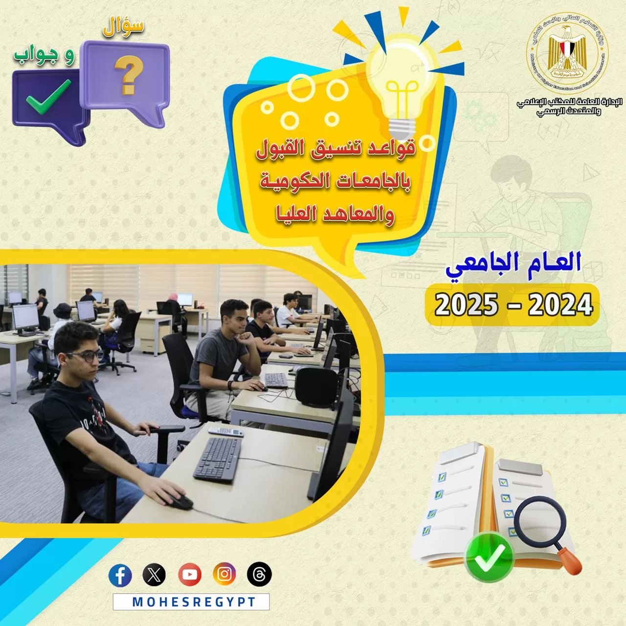 وسيتم نشر الأدلة الإرشادية وكافة الوسائل التوضيحية عبر الموقع الإلكتروني للوزارة والحسابات الرسمية لوزارة التعليم العالي والبحث العلمي على مواقع التواصل الاجتماعي التالية:
