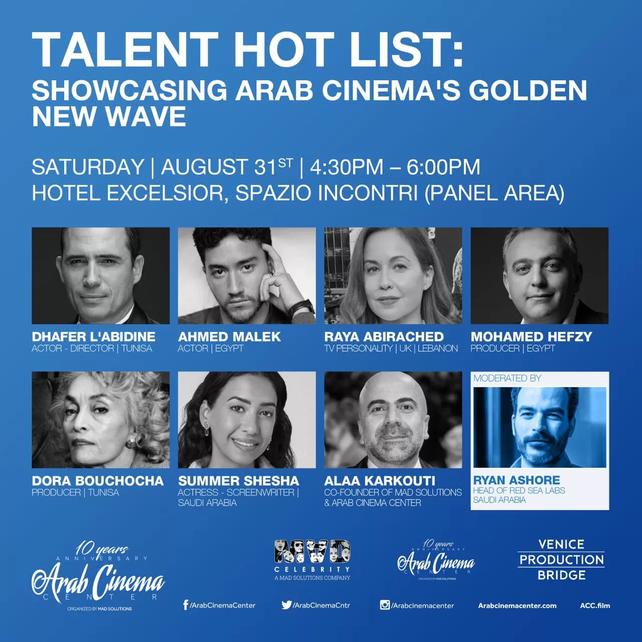 ينظم مركز السينما العربية حلقة نقاشية وذلك ضمن فعاليات الدورة 81 من مهرجان فينيسيا السينمائي الدولي والتي تستمر فعالياتها في الفترة من 28 أغسطس وحتى 7 سبتمبر. تأتي الحلقة النقاشية تحت عنوان “قائمة المواهب المميزة: عرض الموجة الذهبية الجديدة في السينما العربية”.