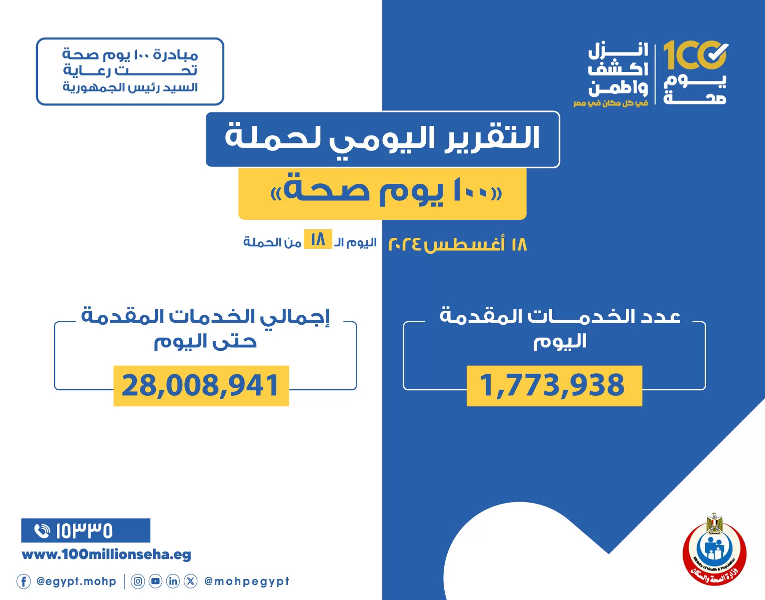 أضاف أن حملة «100 يوم صحة» قدمت 425 ألفا و119 خدمة من خلال قطاع الرعاية العلاجية، إلى جانب تقديم 113 ألفا و676 خدمة تابعة للمبادرات الرئاسية للصحة العامة، كما قدم قطاع الطب الوقائي 48 ألفا و818 خدمة، بالإضافة لتقديم 92 ألفا و593 خدمة، من خلال مستشفيات أمانة المراكز الطبية المتخصصة.مشيرا إلى أن الحملة قدمت 44 ألفا و109 خدمات، من خلال الوحدات التابعة للهيئة العامة للمستشفيات والمعاهد التعليمية، فيما قدمت مبادرة دعم الصحة النفسية 71 ألفا و582 خدمة، فيما قدمت مستشفيات وعيادات الهيئة العامة للتأمين الصحي 206 آلاف و571 خدمة.