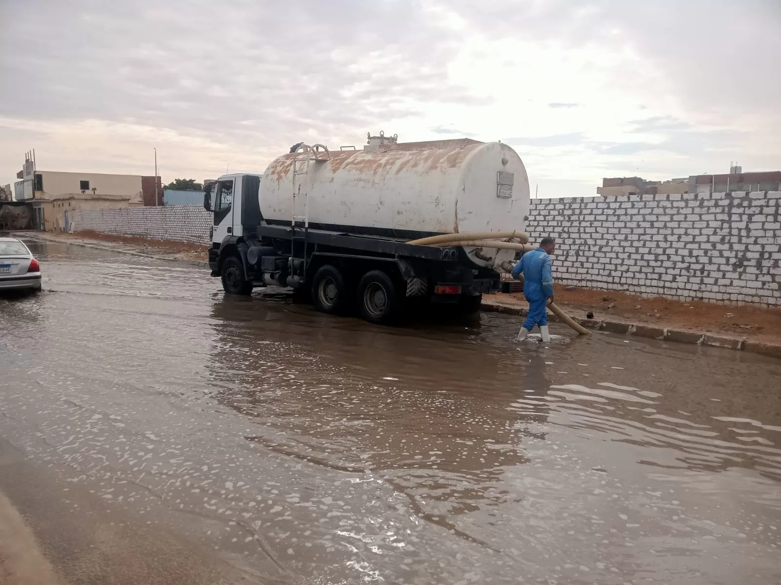 يأتي ذلك تنفيذاً لتوجيهات اللواء خالد شعيب محافظ مطروح بمتابعة التعامل مع الموقف بالمناطق المتضررة من الأمطار .