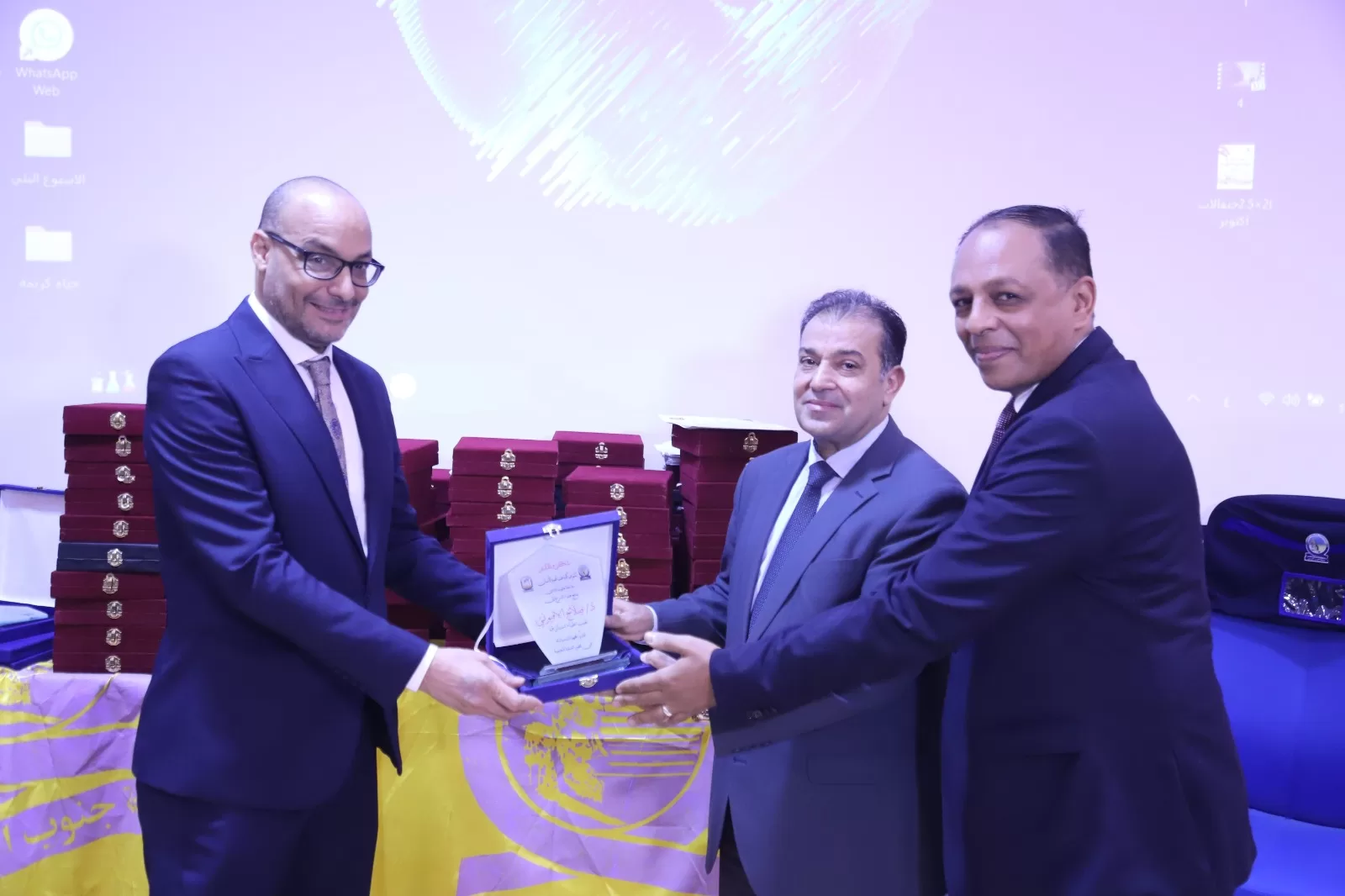 وقام الدكتور احمد طلعت تميرك بإهداء الدروع للدكتور احمد عكاوى رئيس الجامعة والدكتور عباس منصور رئيس الجامعة الأسبق والدكتور محمد سعيد نائب رئيس الجامعة لشئون خدمة المجتمع وتنمية البيئة والدكتور صلاح الأفيونى نقيب اطباء الاسنان بقنا