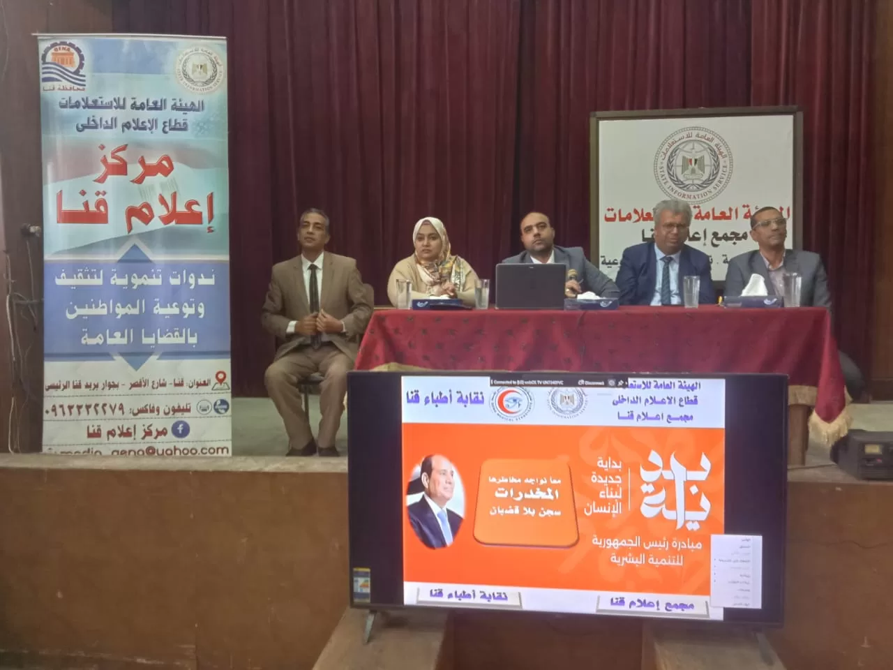 في إطار جهود نشر الوعي المجتمعي بخطورة الإدمان، نظم مجمع إعلام قنا بالتعاون مع نقابة أطباء قنا ندوة بعنوان “معاً نواجه مخاطرها.. المخدرات سجن بلا قضبان”. تأتي الندوة ضمن مبادرة “بداية جديدة لبناء الإنسان”، التي تسعى لتعزيز قيم التوعية ومكافحة الإدمان، تحت مظلة حملة “إيد في إيد هننجح أكيد”، وهي إحدى المبادرات الرئاسية للتنمية المجتمعية والتثقيف الصحي.