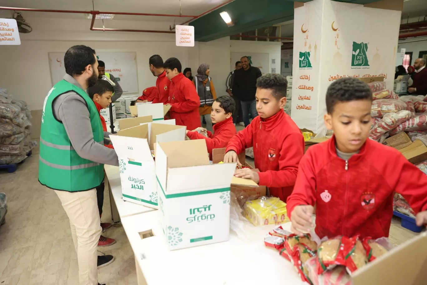 وقام عدد من مسئولي الأكاديمية واللاعبين، وعلى رأسهم الكاتبن رامي عبد الحفيظ مدير أكاديمية النادي الأهلي فرع الجزيرة، بتعبئة محتويات كرتونة الخير، والتي تشمل على كمية هائلة من السلع الغذائية الأساسية اللازمة لاحتياج الأسرة طوال شهر رمضان.