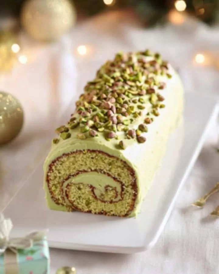 تُخفق الكريمة السائلة حتى تتماسك مع السكر البودرة. قم بدمج معجون الفستق والماسكاربوني بلطف. افردي البسكويت المبرد ثم وزعي طبقة سخية من كريمة الفستق. لفيها بإحكام ثم ضعيها في الثلاجة لمدة ساعتين. قم بتغطية الرولي بالكريمة المتبقية. يرش مسحوق الفستق، ويرش بالفستق المحمص ويضاف إليه حبات السكر لإضفاء