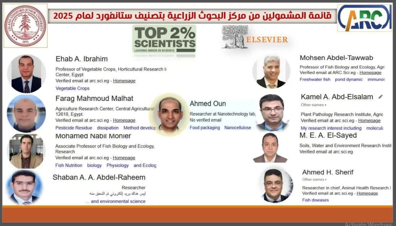 ومن جهته، قال الدكتور عادل عبدالعظيم رئيس مركز البحوث الزراعية، ان التصنيف الذي اصدرته جامعة ستانفورد الأمريكية، بالتعاون مع مؤسسة السفير العالمية، لأفضل 2% من العلماء الأكثر تأثيرًا حول العالم، قد شمل كل من: الدكتور محسن عبد التواب والدكتور محمد نبيل منير من المعمل المركزي لبحوث الثروة السمكية، فضلا عن الدكتور محمد السيد عيد، والدكتور شعبان عبدالرحيم من معهد بحوث الأراضي والمياه والبيئة، إضافة إلى الدكتور كامل احمد عبدالسلام من معهد بحوث أمراض النباتات.