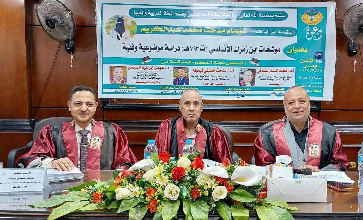 بعد مناقشات علمية مستفيضة ورصينة استمرت لعدة ساعات في رحاب كلية الآداب بجامعة طنطا قررت لجنة الحكم والمناقشة منح الباحثة “شيماء مدحت محمد عبدالكريم” بقسم اللغة العربية وآدابها درجة الماجستير ،مع الإشادة بجهود الباحثة وتميز موضوع الدراسة.