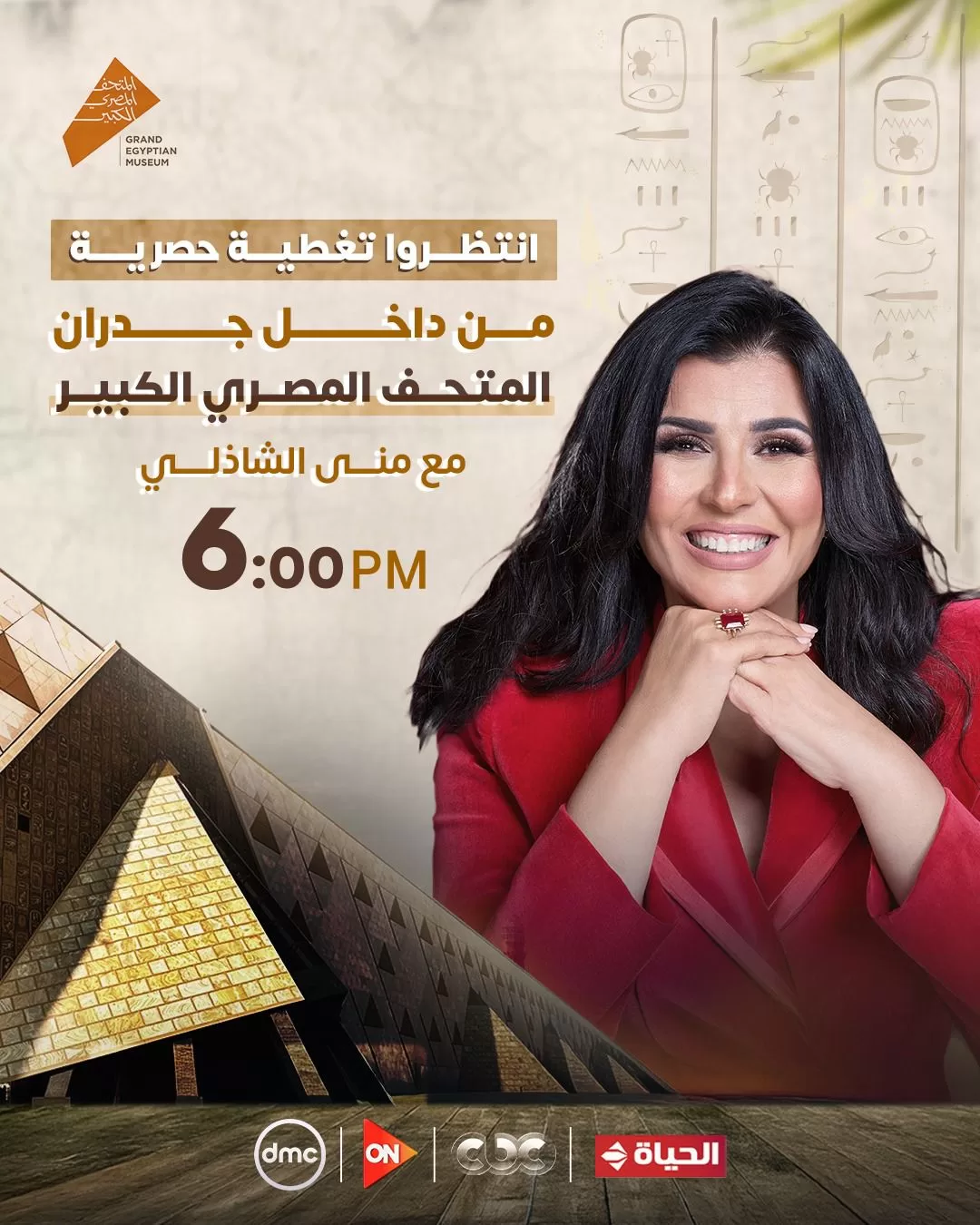 تذاع التغطية على قنوات DMC، ON، CBC، وقناة الحياة، لتواكب الافتتاح المرتقب للمتحف المصري الكبير، أحد أضخم وأحدث المتاحف في العالم، والذي يُعد أيقونة حضارية تجمع بين التاريخ المصري العريق وروح الحداثة في التصميم والتقنيات المتحفية المتقدمة.