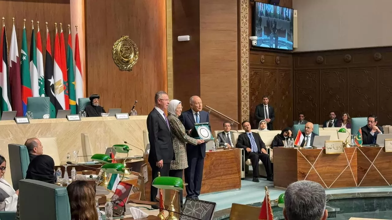 سلّم السيد أحمد أبو الغيط، الأمين العام لجامعة الدول العربية، درع الجامعة للدكتورة أمال إمام، المديرة التنفيذية للهلال الأحمر المصري؛ تقديرًا لجهود الجمعية الإنسانية المتواصلة في دعم الشعب الفلسطيني في قطاع غزة.