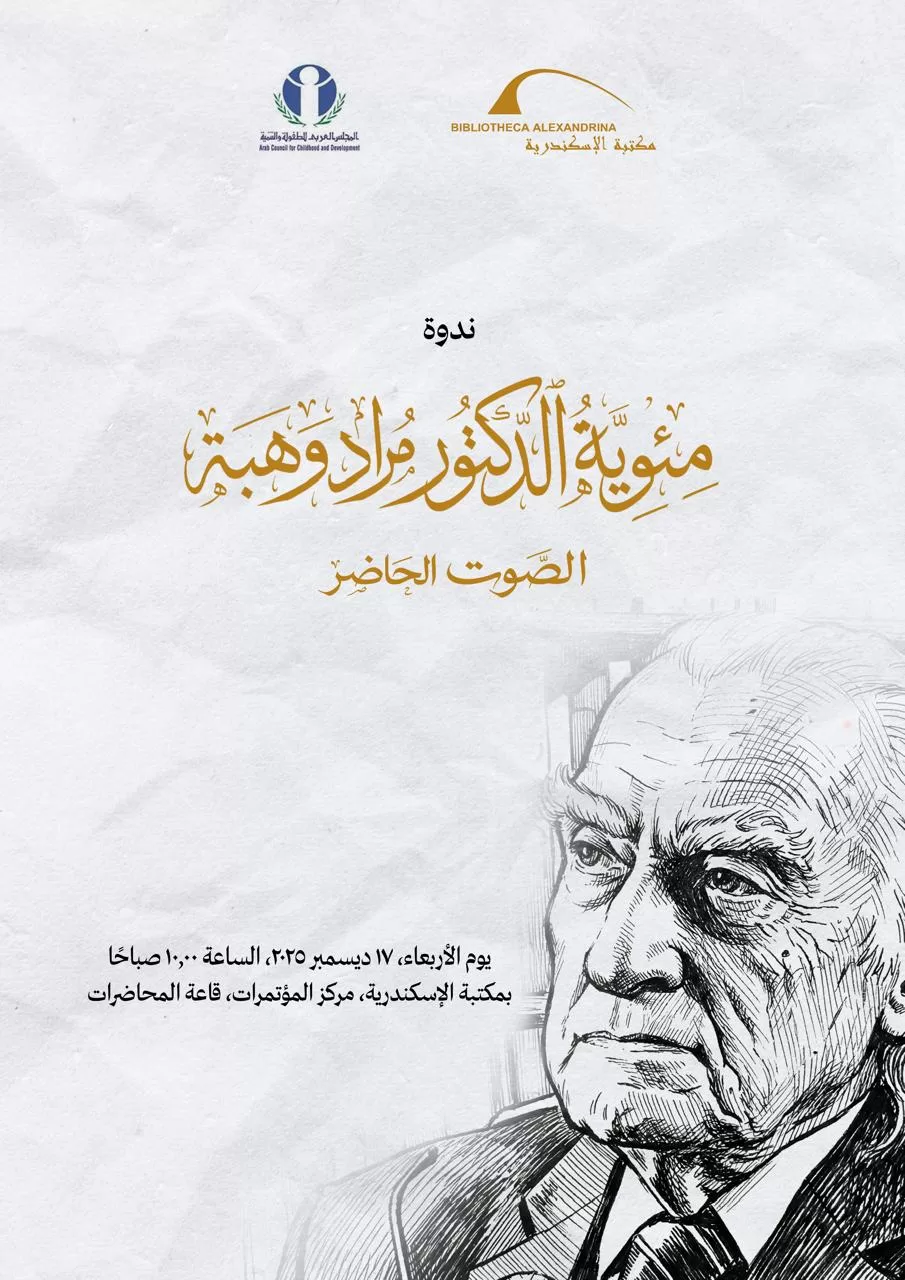 تنظم مكتبة الإسكندرية بالتعاون مع المجلس العربي للطفولة والتنمية ندوة بعنوان “مئوية المفكر الكبير الدكتور مراد وهبة.. الصوت الحاضر”، وذلك يوم الأربعاء الموافق 17 ديسمبر، في تمام الساعة العاشرة صباحاً بمركز المؤتمرات بالمكتبة.