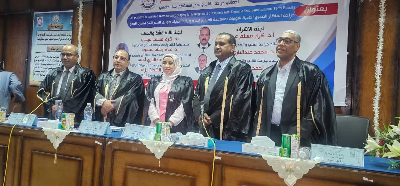 وضمت لجنة المناقشة والتحكيم، الأستاذ الدكتور علاء رشاد رئيس قسم أمراض الصدر بجامعه قنا، الأستاذ الدكتور معتز رزق أستاذ جراحة القلب والصدر بجامعة بنها.