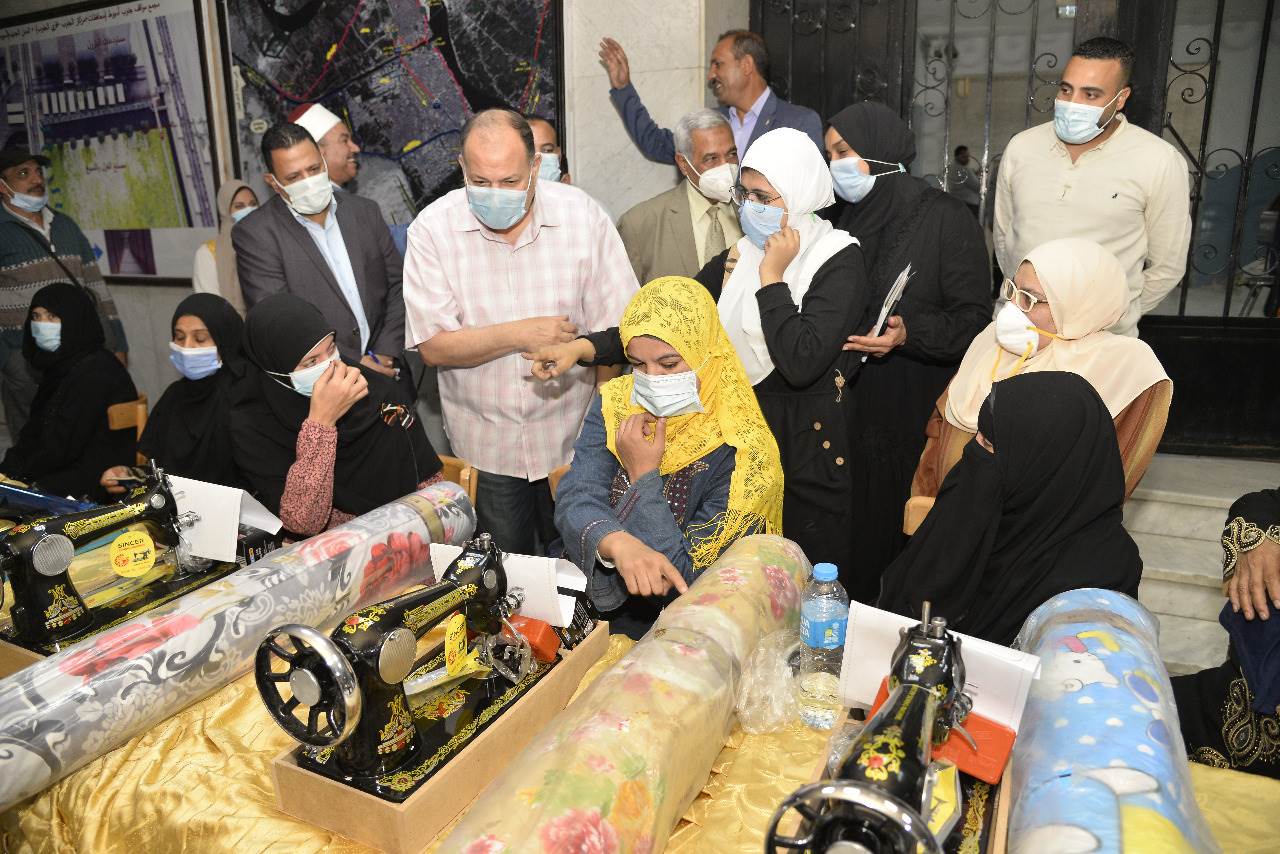 وسلم المحافظ 8 ماكينات خياطة بأثواب أقمشة لكل ماكينة و8 أفران منزلية بإسطوانات البوتاجاز و8 أجولة دقيق مقدمة لعدد من السيدات ذوي الهمم والاحتياجات الخاصة والمرأة المعيلة من الأسر الأولى بالرعاية.