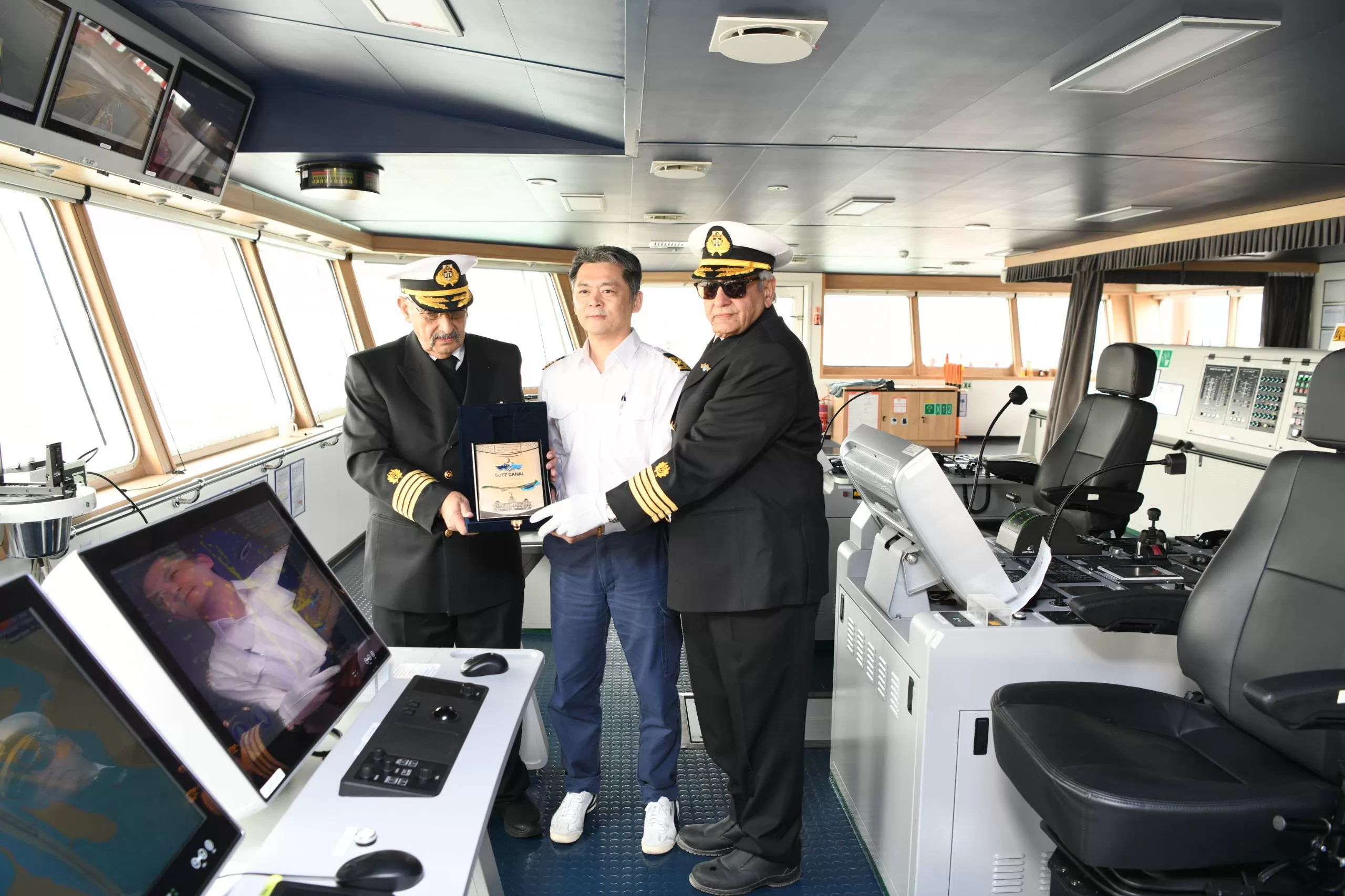 وتنفيذاً للبروتوكول المتبع، صعد كبار مرشدي الهيئة على متن السفينة للترحيب بطاقمها وتقديم هدية تذكارية لربانها، تقديراً لمرورها الأول عبر المجرى الملاحي العالمي.