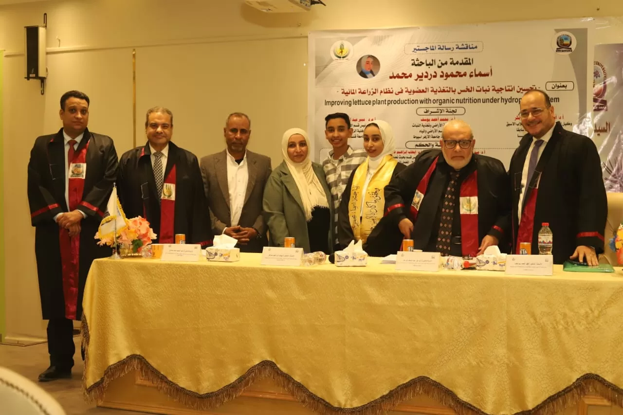 ناقشت كلية الزراعة بجامعة قنا رسالة الماجستير المقدمة من الباحثة أسماء محمود دردير محمد، بعنوان «تحسين إنتاجية نبات الخس بالتغذية العضوية في نظام الزراعة المائية»، وذلك في إطار توجه الجامعة لدعم البحث العلمي وتطبيقاته في مجالات الزراعة المستدامة والتقنيات الحديثة.